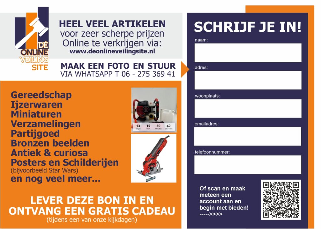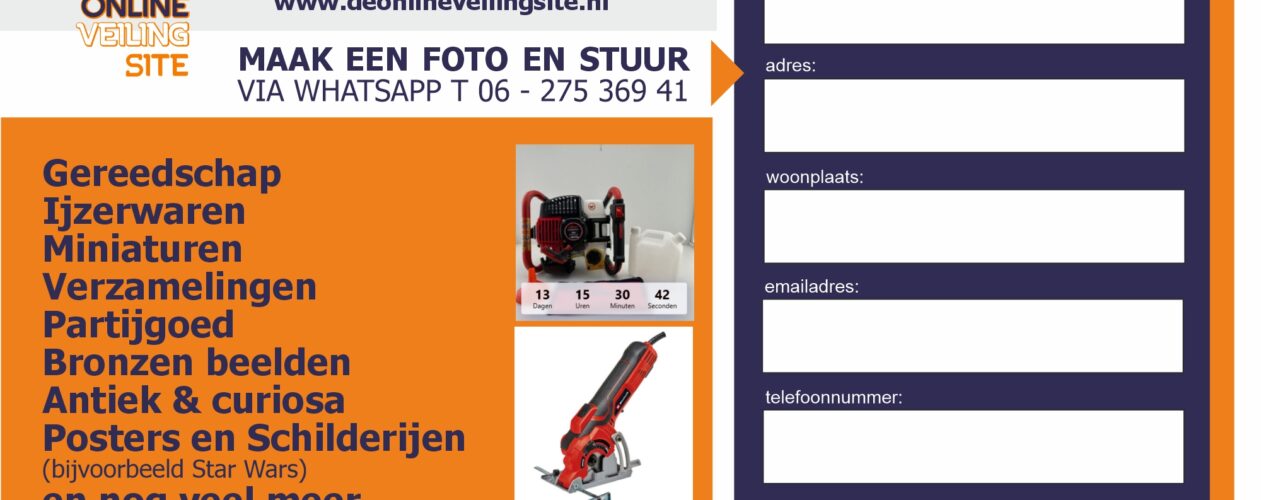 Dè Online Veilingsite is onderdeel van Partijhandel Oost, houdt onze sociale kanalen in de gaten voor openingstijden, aankondigingen en aanbiedingen.